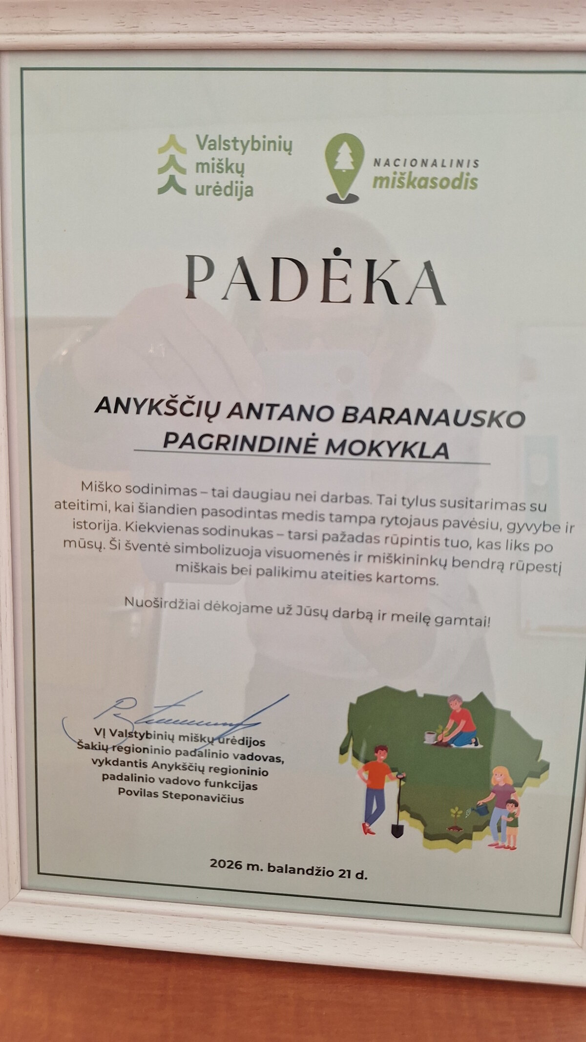 Anykščių Antano Baranausko pagrindinės mokyklos 8b ir 6b klasės mokiniai balandžio 21 d. dalyvavo naudingoje aplinkai ir žmonėms veikloje – miško sodinime. Mūsų mokyklos mokiniai mišką sodina jau ne pirmus metus. Šiemet VMU Anykščių regioninio padalinio miškininkai buvo užauginę ąžuoliukų ir šermukšnių sodinukų, kuriuos mokiniai pasodino. Miškininkai pamokė, kaip naudotis jų darbo įrankiais, kaip saugiai ir teisingai sodinukų šaknis užberti, kad augalas sėkmingai prigytų. Šiemet sodinome ąžuoliukus netoli pernykščio ploto, kur pasodinti buko medeliai. Aštuntokai patikrino, kaip atrodo pernai sodintų medelių plotas, o po darbų grįžtant į mokyklą dar pažiūrėjome Anykštos upės kaskadas, kurios įrengtos buvusio malūno vietoje. Ačiū VMU miškininkams ir mokiniams už visapusiškai naudingą veiklą ir bendradarbiavimą.