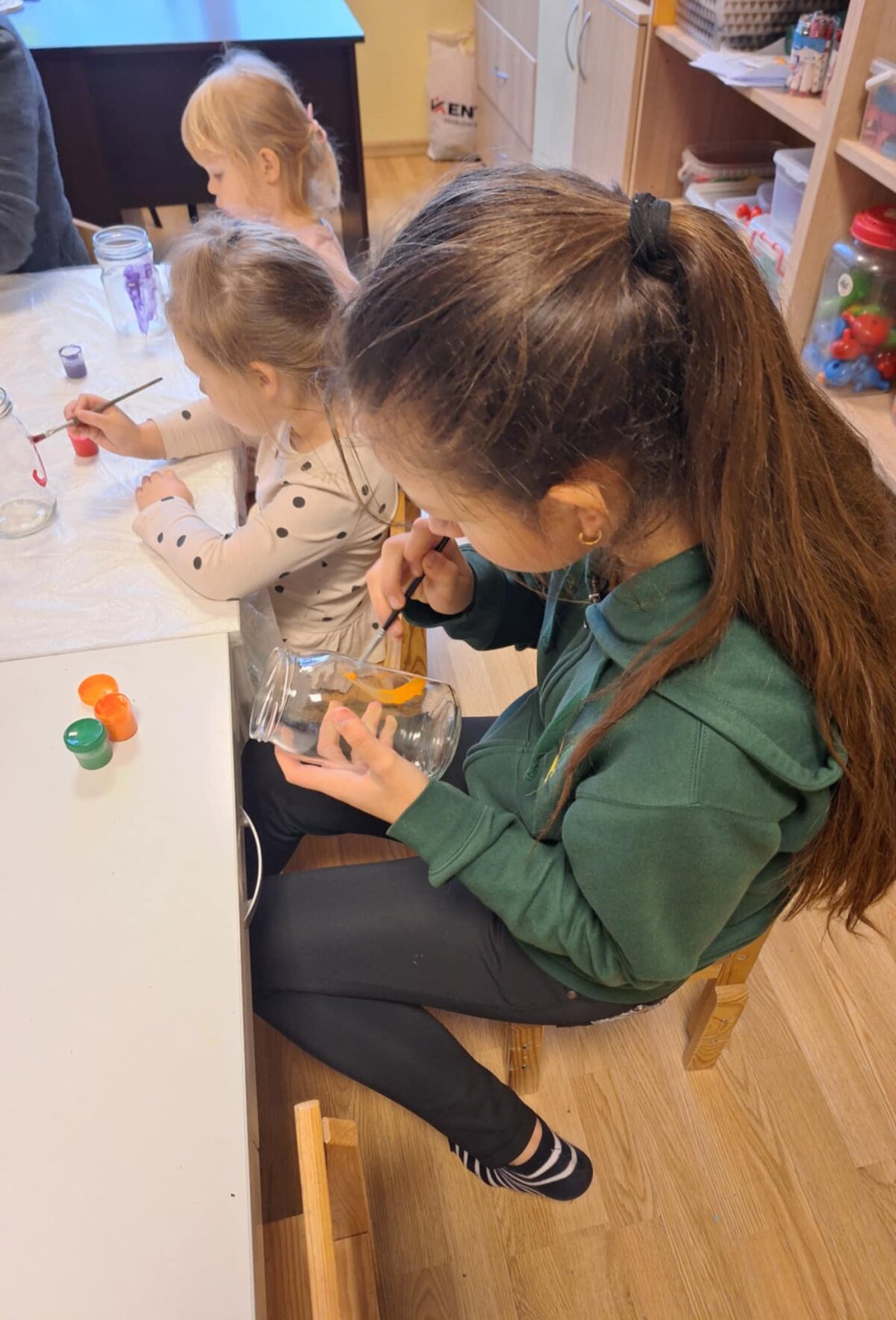 Kurklių St. Kairio ikimokyklinės grupės vaikai kartu su bibliotekininke Gražina susirinko į kūrybines dirbtuvėles. Vaikai paprastus stiklainius pavertė stebuklingais žibintais, kurie skleidė stebuklingas švieseles. Ši popietė buvo pilna idėjų šilta, draugiška ir spindinti kūrybos džiaugsmu.