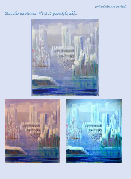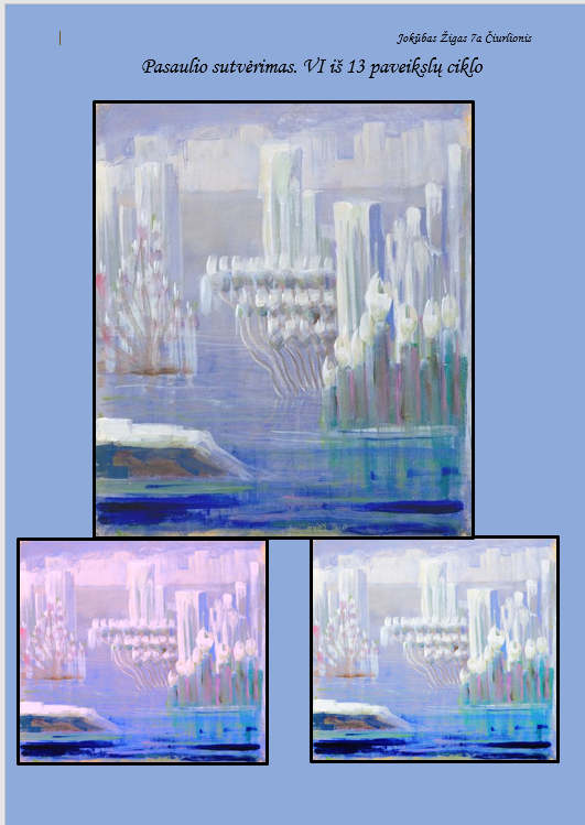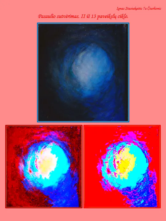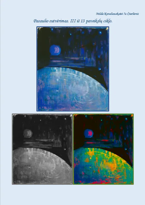 Šiais metais, minint M. K. Čiurlionio 150-ąsias gimimo metines, informatikos pamokoje buvo skirta ypatinga užduotis – susipažinti su menininko paveikslų ciklu „Pasaulio sutvėrimas. 13 paveikslų“ ir jį kūrybiškai interpretuoti.