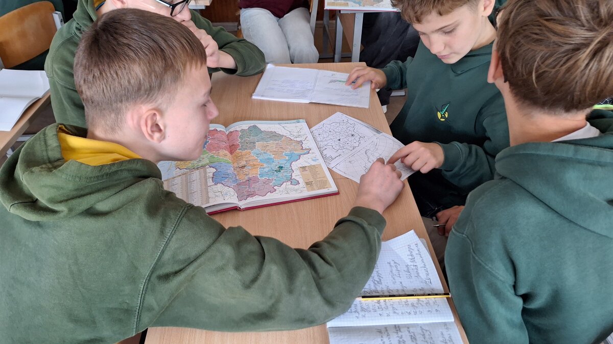 7a ir 8b geografijos pamokos tema buvo „Kada pasaulis pavirsta žemėlapiu?“. Mokiniai padedant mokytojai, prisiminė M.K Čiurlionio biografijos faktus ir vietas. Jas pažymėjo kartoschemoje naudojantis žemėlapiu. Po to mokiniai atliko kūrybinę užduotis „Kai Čiurlionis atvyksta į Anykščius“ kurioje turėjo sudaryti lankomų vietų sąrašą, kurias pasiūlytų M.K Čiurlioniui aplankyti ir paaiškinti, kodėl tie objektai verti dėmesio.