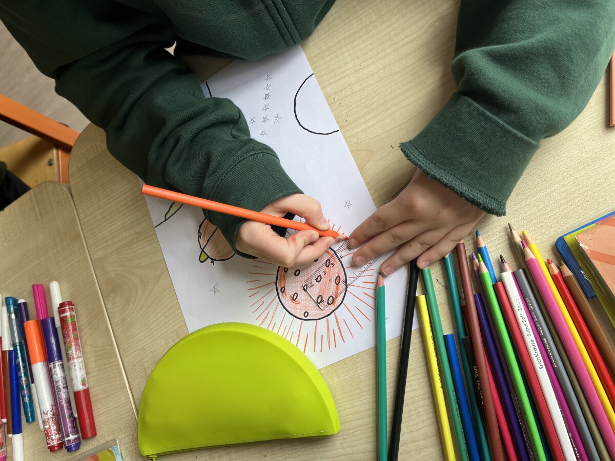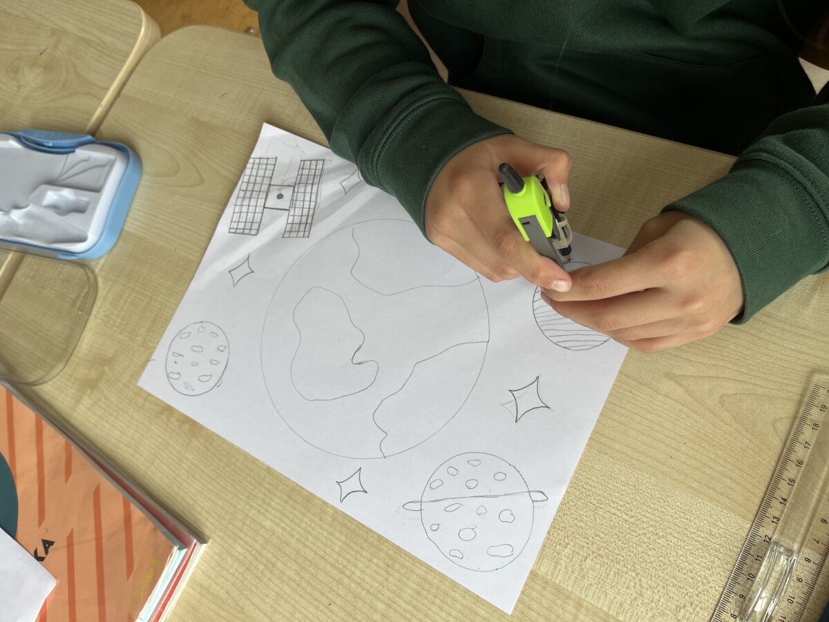 Matematikos pamokoje pažiūrėję M. K. Čiurlionio paveikslų ieškojo geometrinių figūrų, simetrijos, su skriestuvu ir liniuote kūrė ,,kosminį paveikslą“.