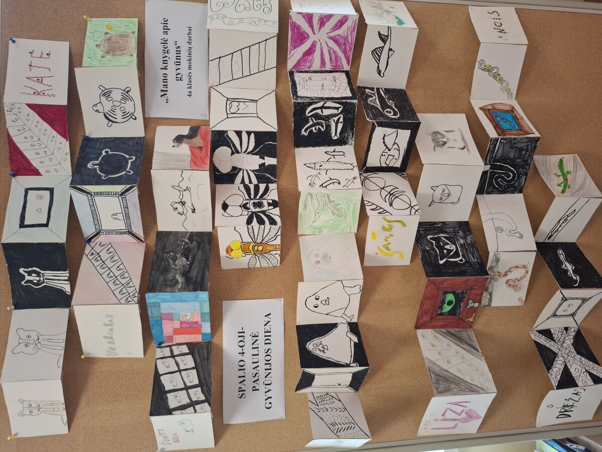 Spalio mėnesį minima pasaulinė gyvūnų diena, todėl 4a klasės mokiniai per dailės pamokas kūrė knygeles apie gyvūnus. Teko prisiminti įvairią techniką: animaciją, ornamentą. Ketvirtokai savitu stiliumi turėjo užrašyti pavadinimą ir surengė knygelių parodą mokyklos bibliotekoje.