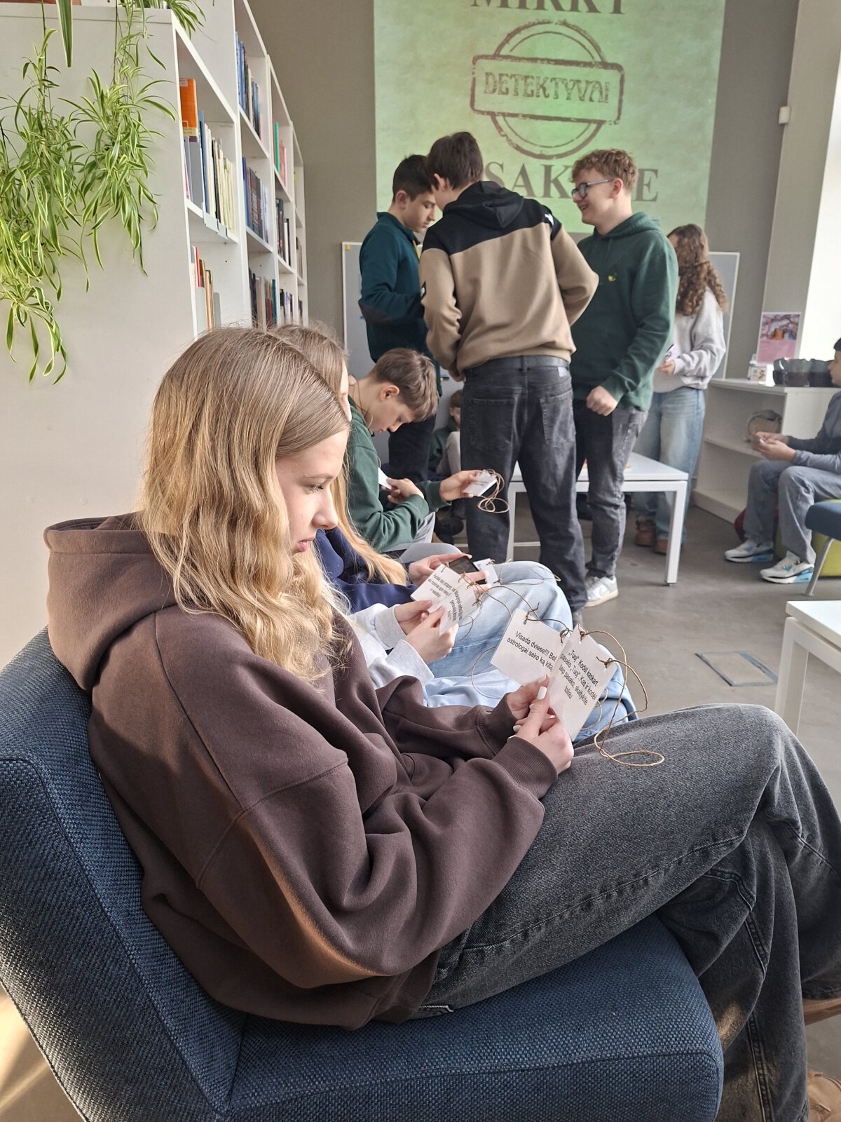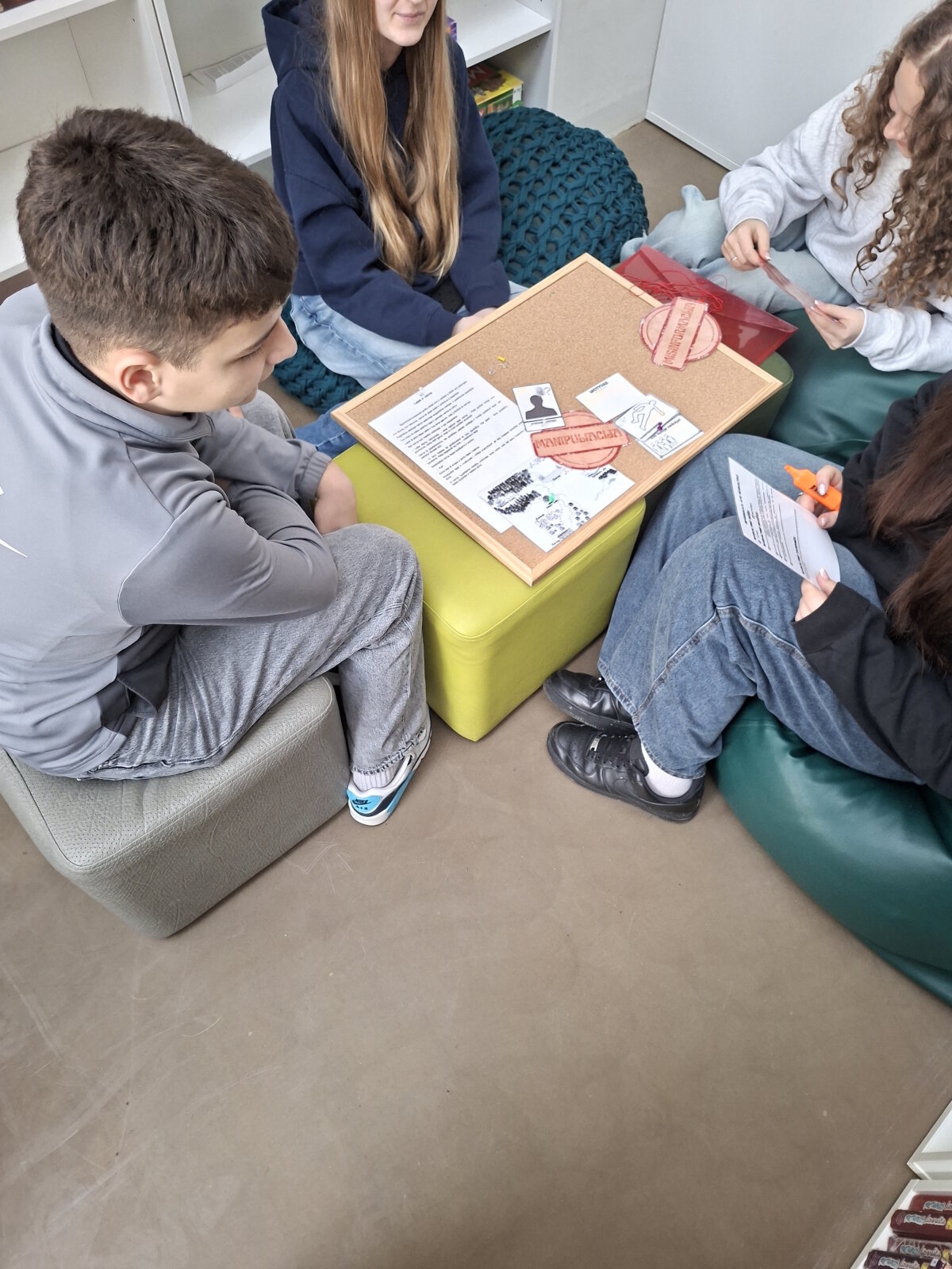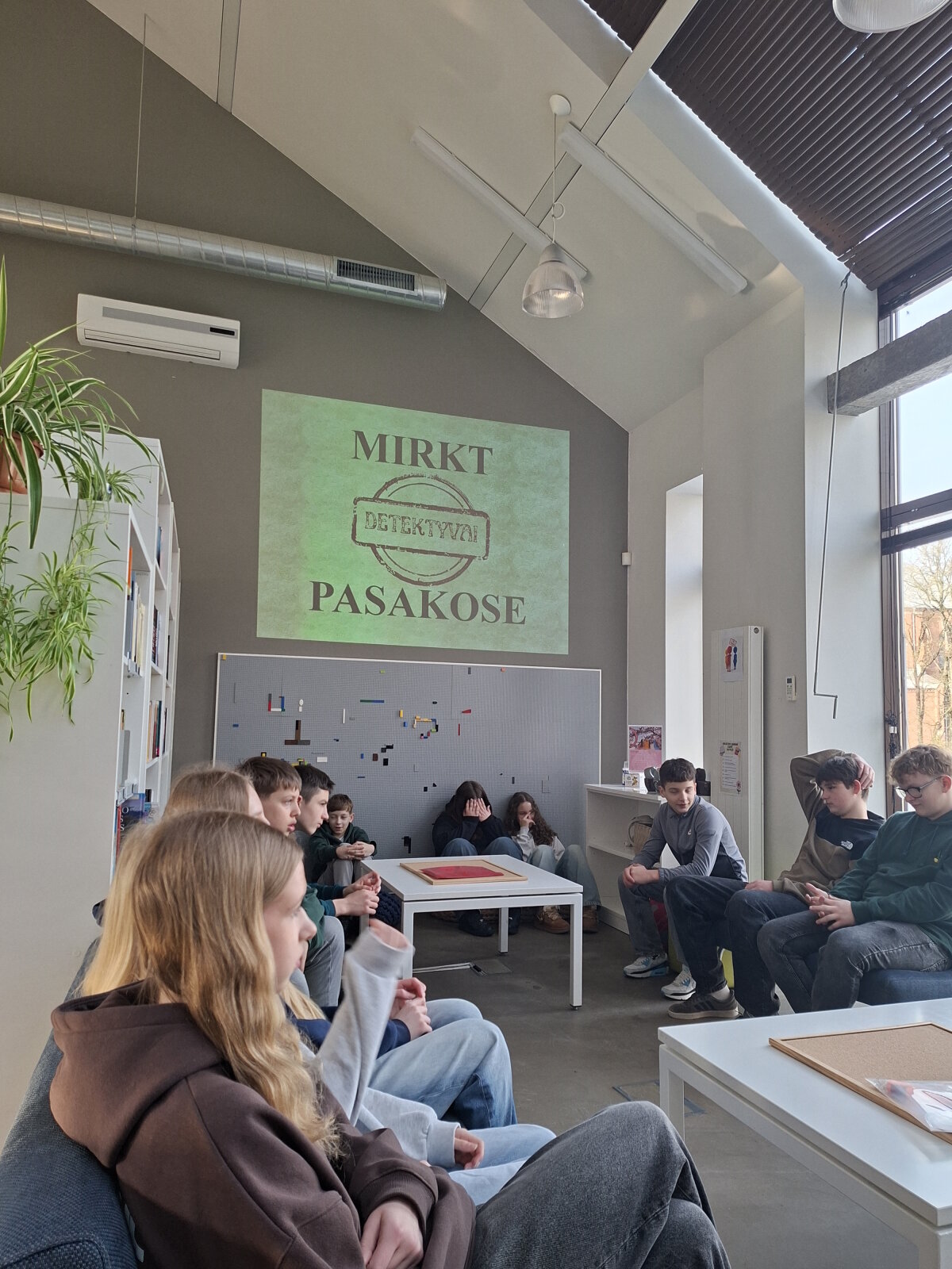 7b klasės mokiniai skubėjo į Anykščių L. ir S. Didžiulių viešąją biblioteką ir edukatorės Eglės pakviesti tapo pasakų detektyvais. Prieš pradėdami detektyvų veiklą mokiniai išsiaiškino, kas yra dezinformacija, misinformacija, malinformacija, propaganda, tapatybės vagystė.